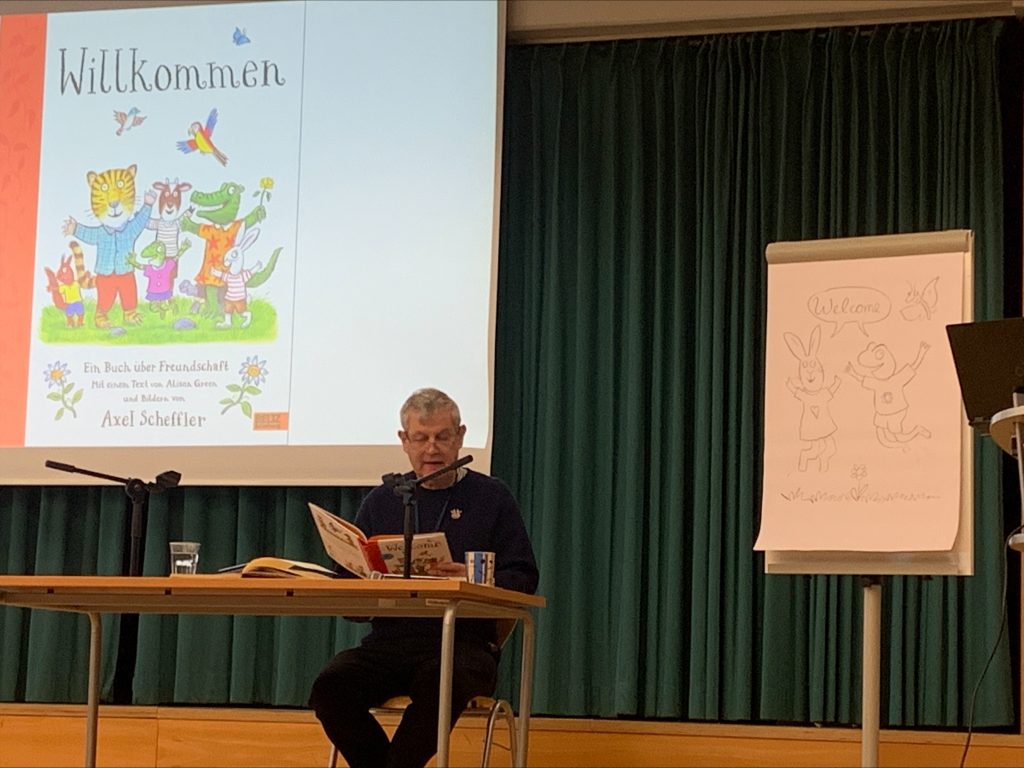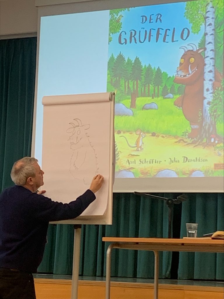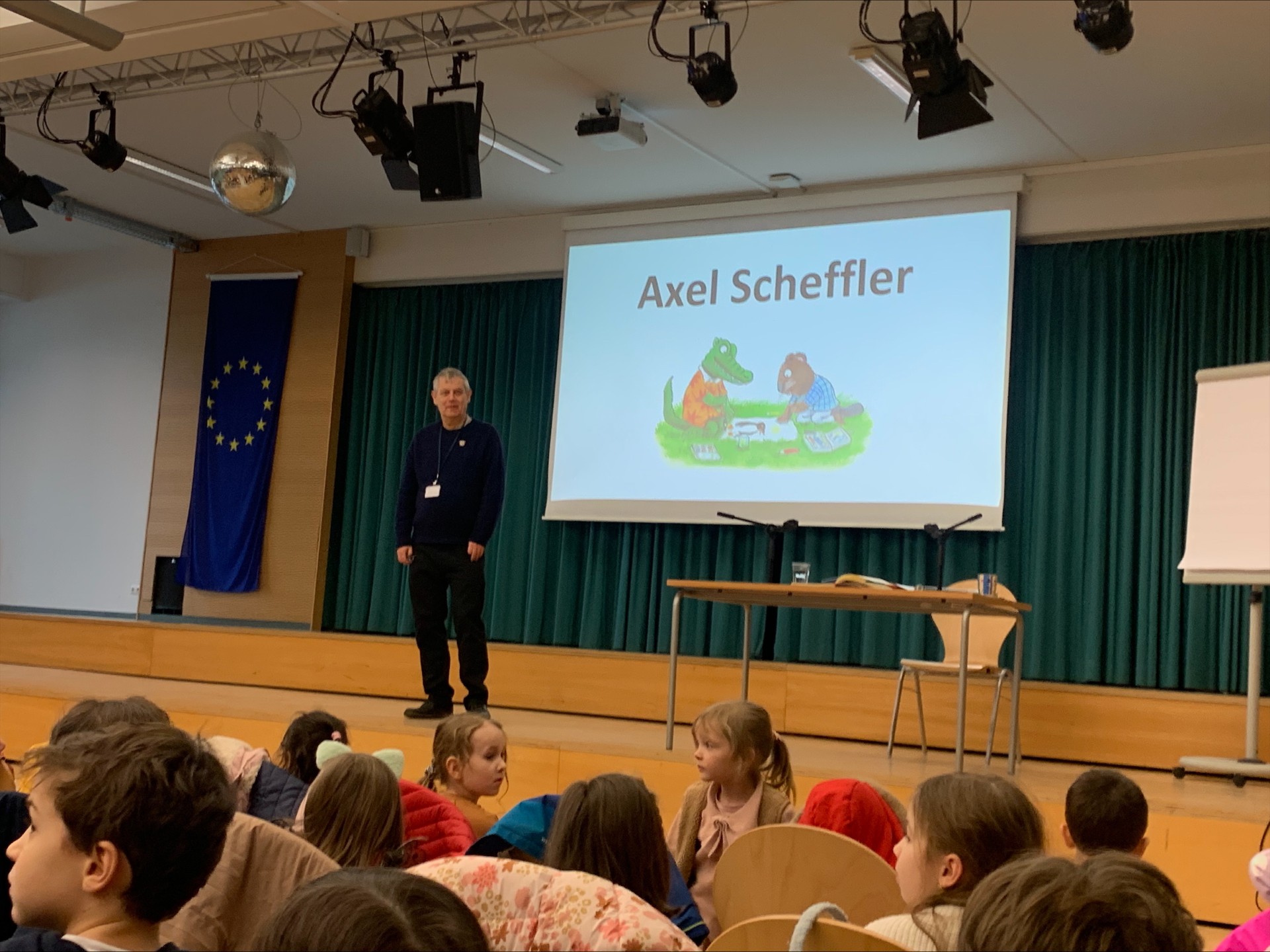 Abwechselnd lasen die beiden den Kindern der beiden ersten deutschen Klassen aus “Ella” von Timo Parvela vor, ein brüllend komisches Buch, das Anu Stohner aus dem Finnischen ins Deutsche übersetzt hat.